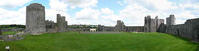 Panorama of the outer ward of Pembroke Castle, Pembrokeshire, Wales. May 2003. Click on the photo for a larger version.
