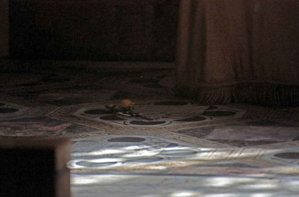 Flowers on the marker for Anne Boleyn in the Chapel of St. Peter ad Vincula in the Tower of London. Photo May 19, 1998.