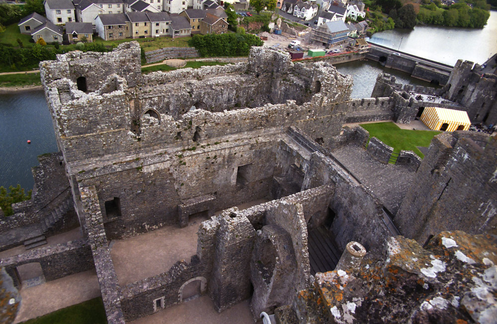 The Great Hall (far, closer to the river) and old Norman Hall of Pembroke Castle seen from the Great Keep. Photo May 2003.