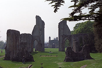 Some of the ruins of Glastonbury Abbey, dissolved in 1539 under Henry VIII. Photo May 1998.