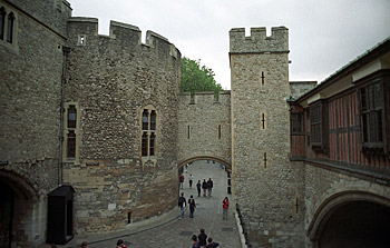 Buildings of the Tower of London. L to R: The Bloody Tower, The Wakefield Tower, Henry III’s Watergate, and St. Thomas’s Tower. Photo June 2000.