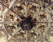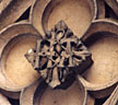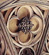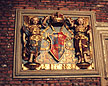 Intricate carvings under Anne Boleyn's gate. Several symbols are visible such as the Tudor Rose in the center, a fleur-di-lis, the Boleyn falcon and the Beaufort portcullis.