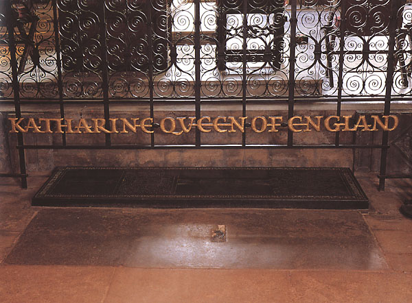 Catherine of Aragon's gravesite at Peterborough Cathedral. A new tablet in her memory was placed here in 1986, inscribed: A Queen cherished by the English people for her loyalty, piety, courage and compassion.