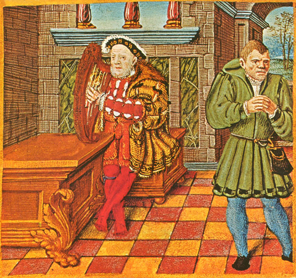 Henry VIII playing a harp, with his fool Will Somers; from the King's Psalter |