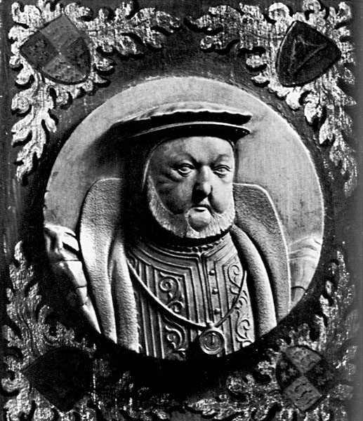 From a stained glass window, the king has the face of Henry VIII, and the face of the woman kneeling may be Kathryn Howard according to Lady Antonia Fraser |