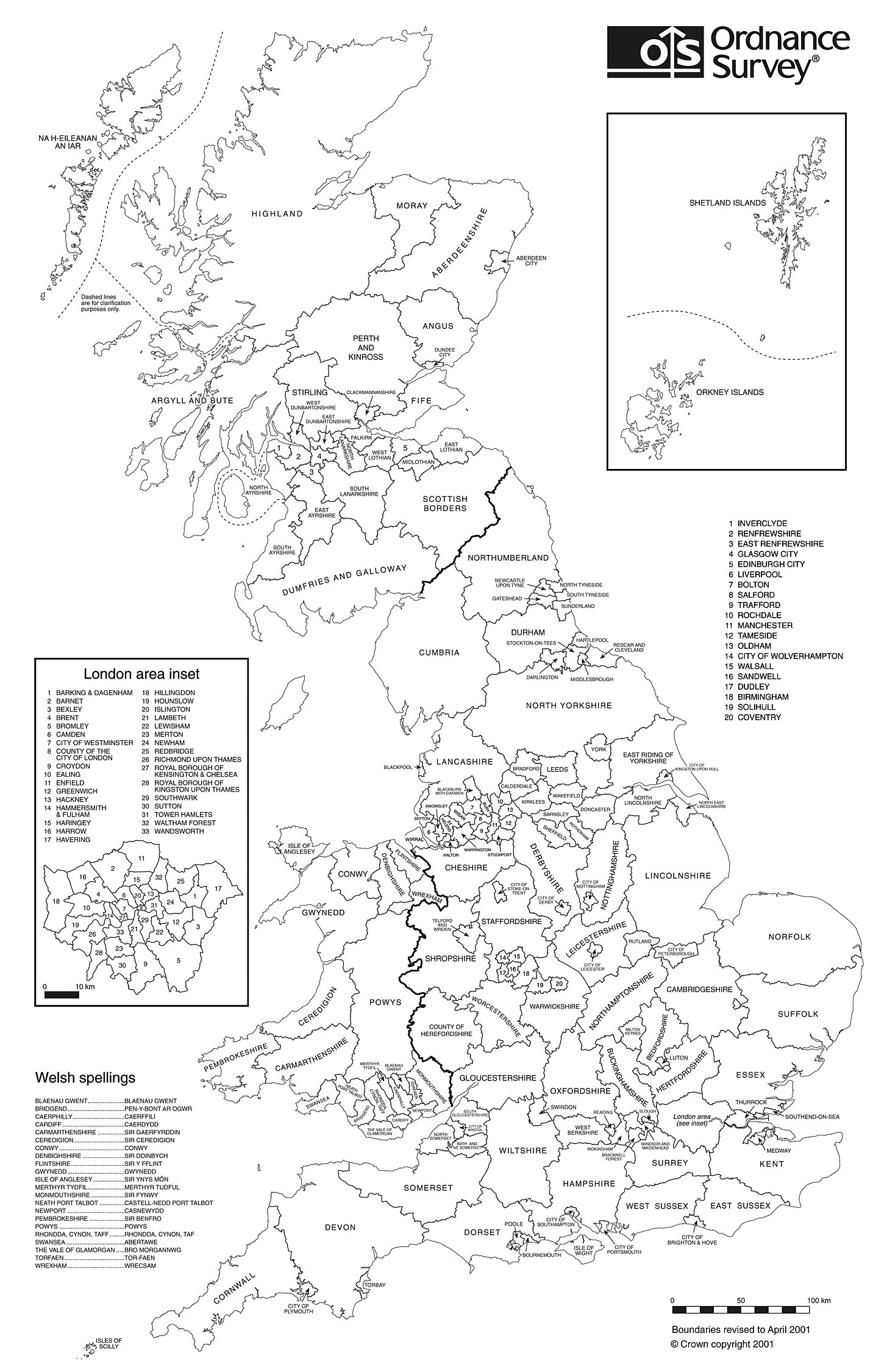 Modern outline map of the United Kingdom (April 2001 boundary revision)