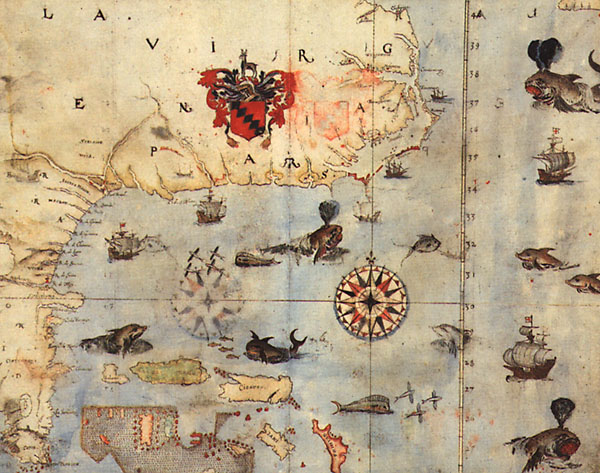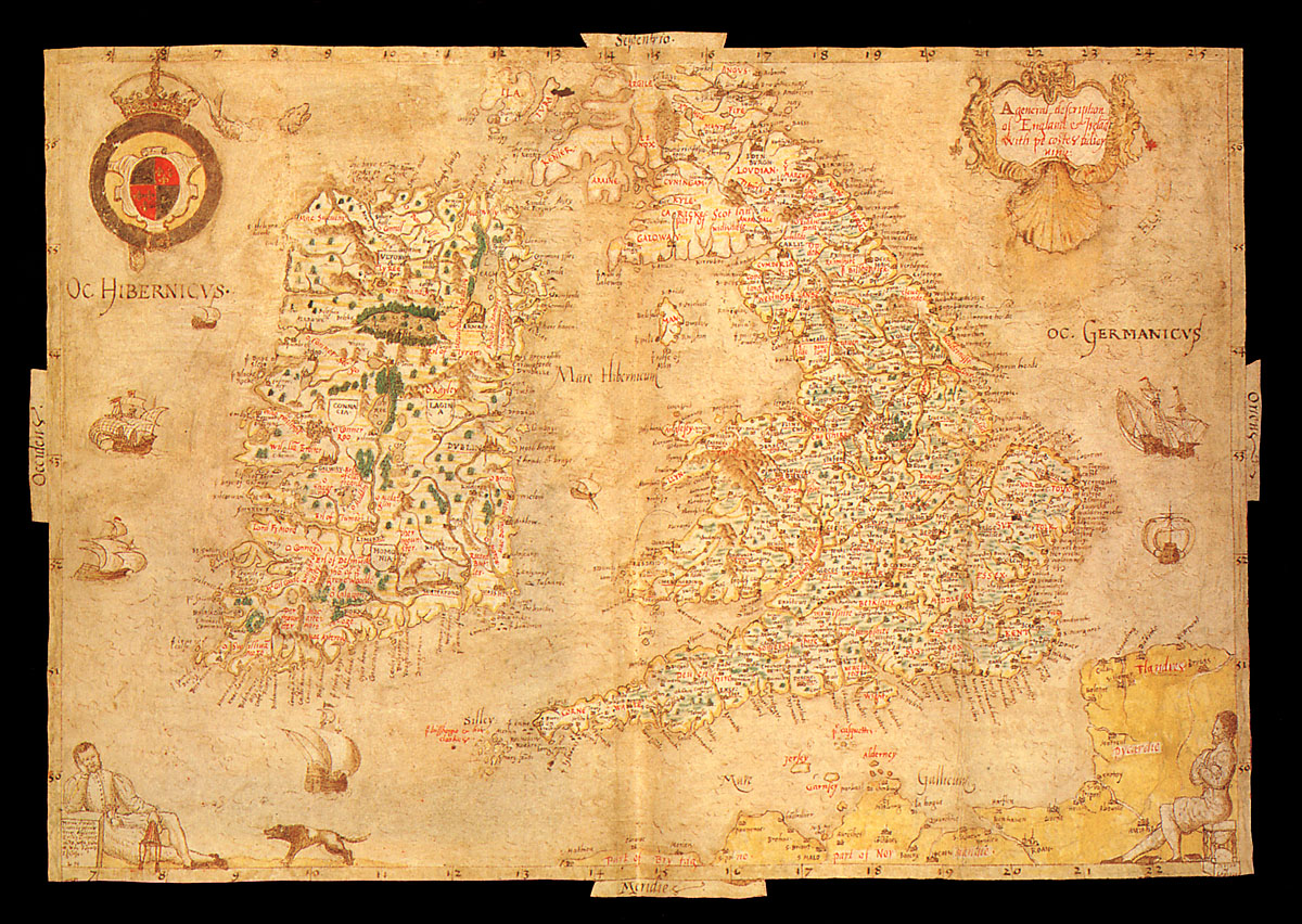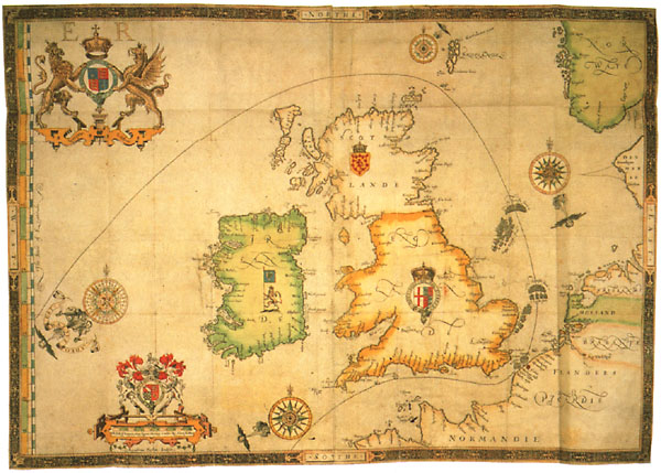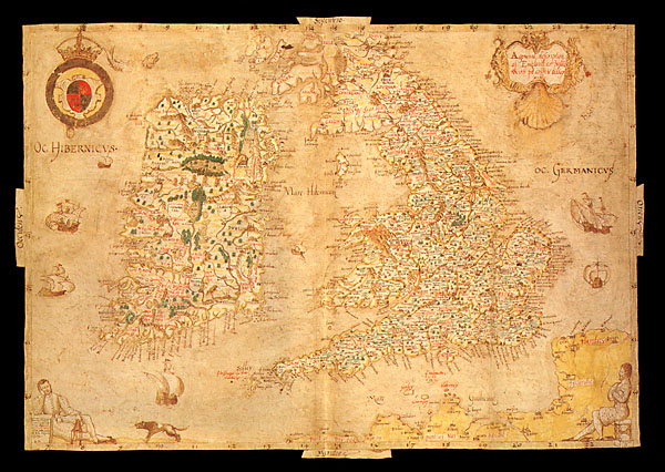 'General Description of England and Ireland' by Laurence Nowell c.1564. The artist is in the lower left hand corner and his patron, Sir William Cecil is in the right corner. Original map size: 21.2 X 30.9 cm Medium resolution(118K) High resolution(470K) Full uncompressed image(12 MB)