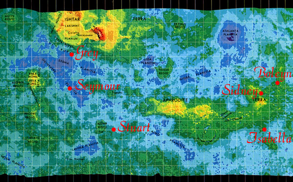 A relief map of the planet Venus. All but one of the features on the planet are named after women. From Tudor times: Jane Grey, Mary Stuart, Isabella of Spain (mother to Catherine of Aragon), Mary Sidney, Anne Boleyn and Jane Seymour. (119K)