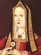 Elizabeth of York was the daughter of Edward IV and Elizabeth Woodville. Born into one of the houses caught in the struggle that would later so eloquently be called 'The Wars of the Roses', one would think that she had a difficult childhood. In fact, she was living a pleasantly secure life until the death of her father in 1483. However, when Edward IV died, things took a decidedly bad turn. Edward IV's heir, Edward V, was residing at Ludlow and set out to London. On the way, his uncle Richard Duke of Gloucester intercepted the caravan and took the young king to the palace lodgings in the Tower of London. Elizabeth Woodville must have distrusted this move by Richard, since she took her remaining son Richard, the Duke of York, and her five daughters to Westminster Abbey. However, Elizabeth was convinced to let Richard join his brother at the Tower (on the premise that the young king was lonely) under the protection of Richard. It was at this time that the young princes (technically a king and a prince) disappeared, and the Lord Protector, brother of the late Edward IV, became king Richard III. How Elizabeth of York reacted to the disappearance of her young brothers was never recorded by history. However, two years after taking the throne, Richard III was defeated by Henry Tudor at the Battle of Bosworth Field in August 1485. Elizabeth was one of the few remaining Yorkists that hadn't been taken care of in one way or another, so the new king, Henry VII, took the fair lady to be his Queen. They were married in 1486. Their marriage symbolically brought an end to the Wars of the Roses (although rebellions would spring up during Henry's reign) and was responsible for the creation of the Tudor Rose- the joining of the white rose of York and the red rose of Lancaster. Of Elizabeth and Henry's seven children, four survived childhood: Arthur, Margaret, Henry and Mary. Their marriage appears to have been a happy one, something that was a bit unusual in the days of political and arranged marriages. Elizabeth died in 1503 on her 37th birthday. Although Henry has had a reputation of thrift, for Elizabeth he opened the purse and gave her a splendid funeral. She lay in state at the Tower of London and was interred at Westminster Abbey. She and her husband lie together in the chapel he had built at the Abbey. Nearby are buried Elizabeth I and Mary Queen of Scots, Henry and Elizabeth's granddaughter and great-granddaughter respectively.
